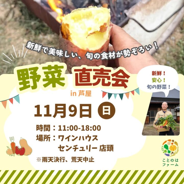 野菜直売会 at ワインハウス センチュリー 芦屋本店 野菜直売会 2025.10.29 2025年11月9日野菜直売会 at ワインハウス センチュリー 芦屋本店11:00 AM - 6:00 PM1981年創業のワイン専門店「ワインハウス センチュリー」さんの軒先でお野菜を販売します。 兵庫県芦屋市東山町7-21 Map野菜直売会