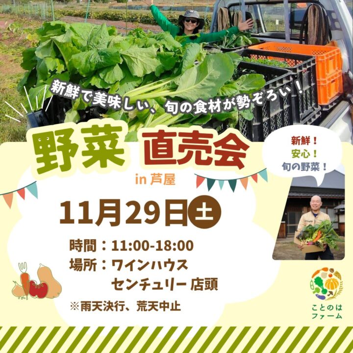 野菜直売会 at ワインハウス センチュリー 芦屋本店 野菜直売会 2025.10.29 2025年11月29日野菜直売会 at ワインハウス センチュリー 芦屋本店11:00 AM - 6:00 PM1981年創業のワイン専門店「ワインハウス センチュリー」さんの軒先でお野菜を販売します。 兵庫県芦屋市東山町7-21 Map野菜直売会