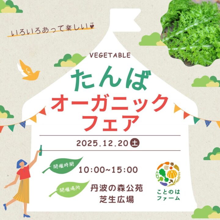たんばオーガニックフェア 野菜直売会 2025.12.01 2025年12月20日たんばオーガニックフェア10:00 AM - 4:30 PM有機農家さんと飲食店がコラボした魅力的な食べ物や、地域や自然との繋がりを感じられる楽しいワークショップの出店を各種予定しています。 兵庫県丹波市柏原町柏原5600 Map野菜直売会