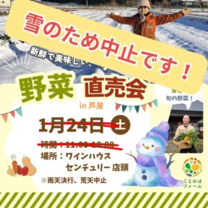 【中止です❗️】野菜直売会 at ワインハウス センチュリー 芦屋本店 野菜直売会 2026.01.012026.01.23 2026年1月24日【中止です❗️】野菜直売会 at ワインハウス センチュリー 芦屋本店11:00 AM - 6:00 PM1981年創業のワイン専門店「ワインハウス センチュリー」さんの軒先でお野菜を販売する予定でしたが、雪で収穫ができないため、中止とさせていただきます。 兵庫県芦屋市東山町7-21 Map野菜直売会