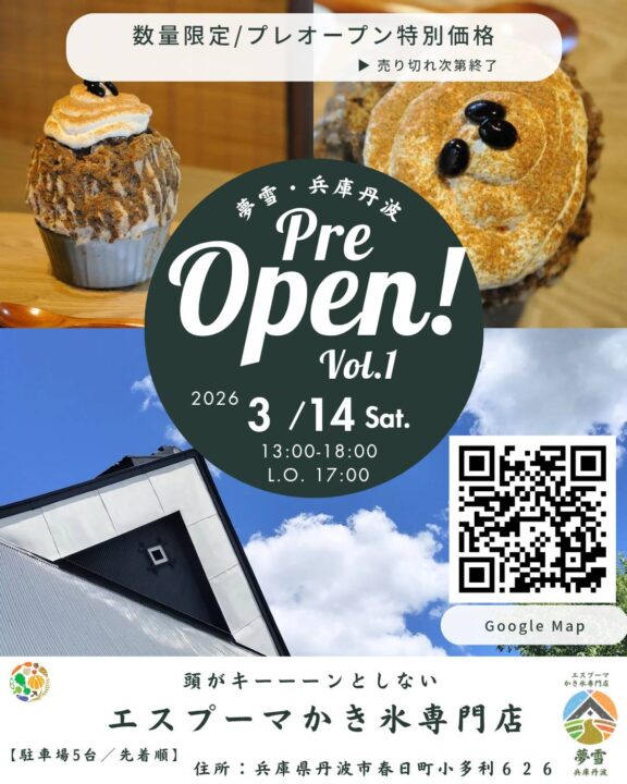 夢雪 in 兵庫丹波 プレオープン1:00 PM - 6:00 PMエスプーマかき氷専門店 夢雪 in 兵庫丹波のプレーオープン♪