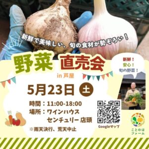 野菜直売会 at ワインハウス センチュリー 芦屋本店 野菜直売会 2026.04.28 2026年5月23日野菜直売会 at ワインハウス センチュリー 芦屋本店11:00 AM - 6:00 PM1981年創業のワイン専門店「ワインハウス センチュリー」さんの軒先でお野菜を販売します。 兵庫県芦屋市東山町7-21 Map野菜直売会
