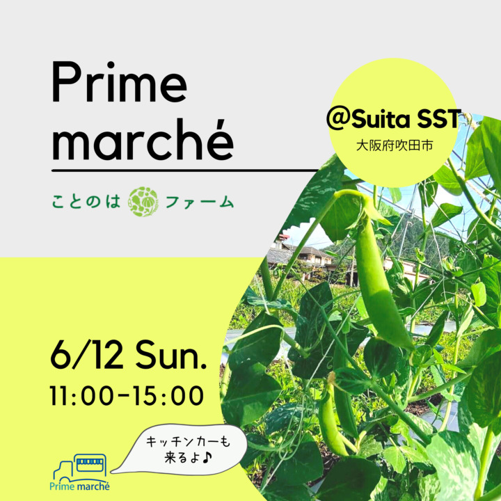 Prime marché @Suita SST 野菜直売会 2025.03.18 2022年6月26日Prime marché @Suita SST11:00 AM - 3:00 PMSuita サスティナブル・スマートタウン(Suita SST)で開催される「Prime marché」に出店します。 ことのはファームの野菜販売以外にも、キッチンかーの出店や各種体験イベントなどもあるので、どうぞお越しください。 大阪府吹田市岸部中5-2-2 Map野菜直売会