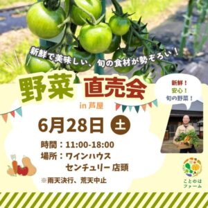 野菜直売会 at ワインハウス センチュリー 芦屋本店 野菜直売会 2025.05.312025.06.29 2025年6月28日野菜直売会 at ワインハウス センチュリー 芦屋本店11:00 AM - 6:00 PM1981年創業のワイン専門店「ワインハウス センチュリー」さんの軒先でお野菜を販売します。 兵庫県芦屋市東山町7-21 Map野菜直売会