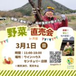 1野菜直売会 at ワインハウス センチュリー 芦屋本店野菜直売会 at ワインハウス センチュリー 芦屋本店Time: 11:00 AM - 6:00 PM 1981年創業のワイン専門店「ワインハウス センチュリー」さんの軒先でお野菜を販売します。